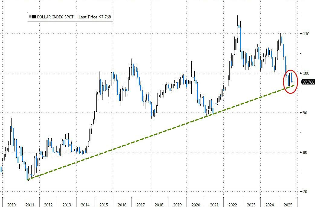 Perhaps the most intriguing chart of the week belongs to the dollar. The post-GFC uptrend was tested and held, but the cracks are showing. It’s as though the dollar is standing on a bridge built in 2009—still intact, but shaking under the weight of shifting flows. The next few weeks will tell us whether it remains a fortress or starts to crumble.