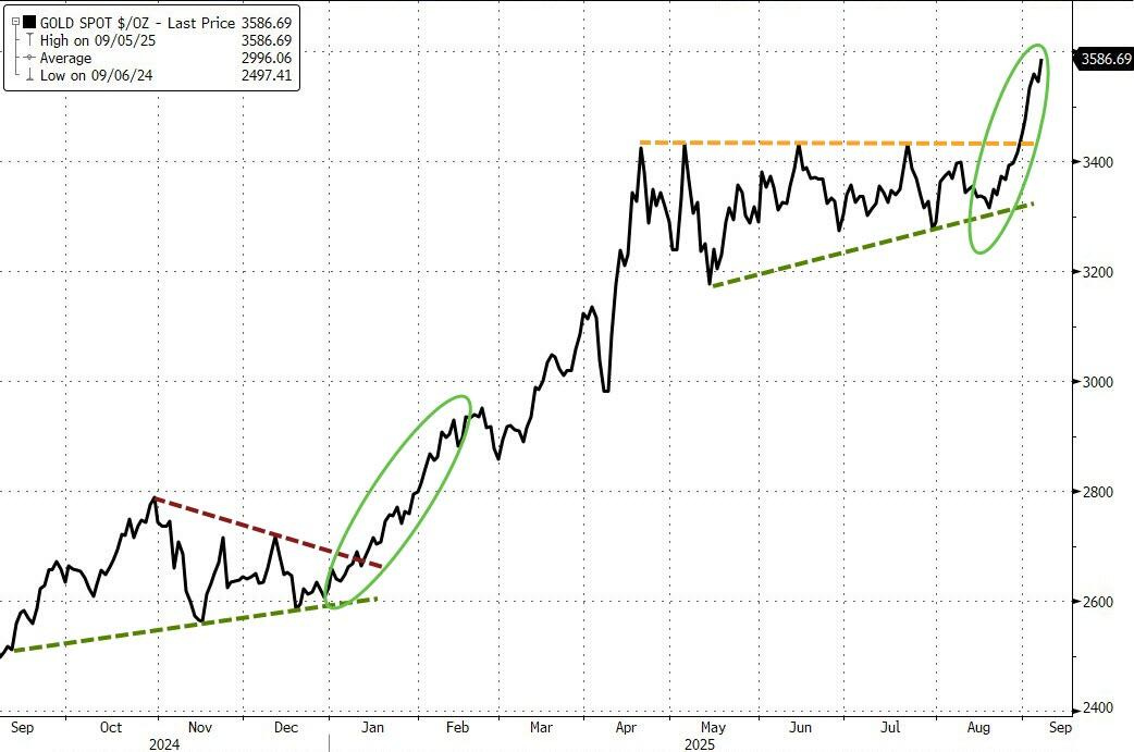 Adding to the uncertainty is inflation’s ability to surprise. If the upcoming data run comes in hot, we could temporarily slip back into what traders call the “September Scaries,” where higher inflation collides with stretched equity valuations. A burst of sticky price data would quickly undercut last week’s bond rally, with yields snapping higher again. That leaves stocks, perched near all-time highs, in a precarious spot. My sense is that this sets the stage not for a new directional trend, but for sideways consolidation with a sell skew and a pick-up in volatility as the week unfolds. In Treasuries especially, brace for whipsaw: the tape can flip from relief rallies to sharp sell-offs in the space of an inflation or jobs headline.