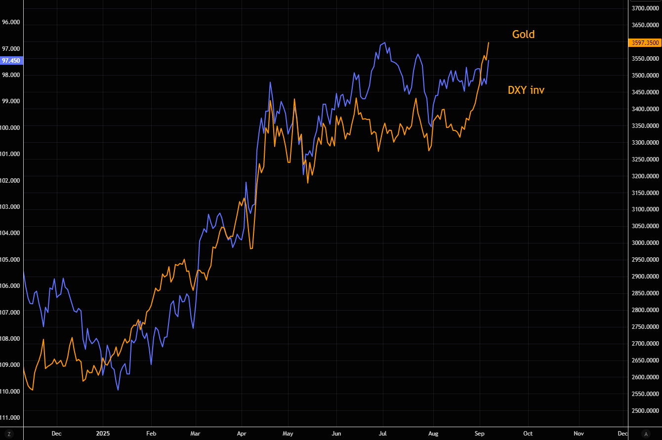 The other prop under gold’s surge is a dollar that can’t find its footing. The correlation is as old as the tape: a soft dollar lubricates gold’s climb. The inverted DXY chart makes the relationship painfully clear—greenback weakness is pouring accelerant on this blaze.