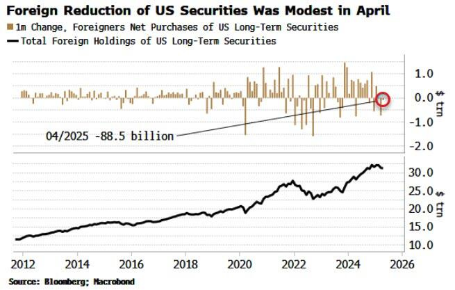 Foreign net selling of U.S. long-term securities came in at around $90 billion, barely a ripple in a $30 trillion ocean. And the stock side of that ledger was soft at best—selling yes, but modest, especially compared to March’s almost $900 billion valuation-driven plunge. In fact, some of that March drop wasn’t even real selling—it was just the books getting marked down.