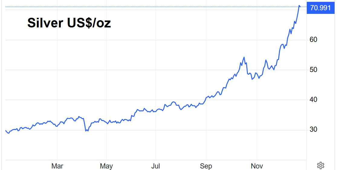 2025 was the year silver stackers were waiting for. The metal blew through $40/oz, then $50 and $60 without a backward glance, and is now testing $70. Many of you are suddenly rich. Nicely done!