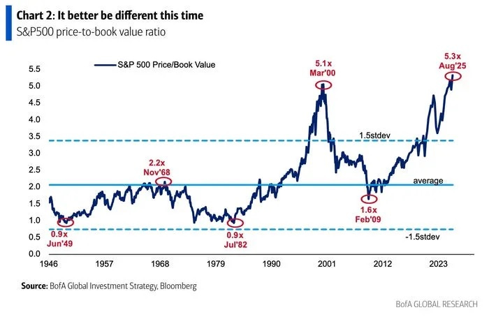Hartnett, who has often expressed skepticism of the market's bull run over the last few years, shared a head-turning chart that highlights just how optimistic investors have become about the impact AI will have. It shows the S&P 500's price-to-book ratio, which measures the total market cap of the index's constituents compared to their total assets minus liabilities.