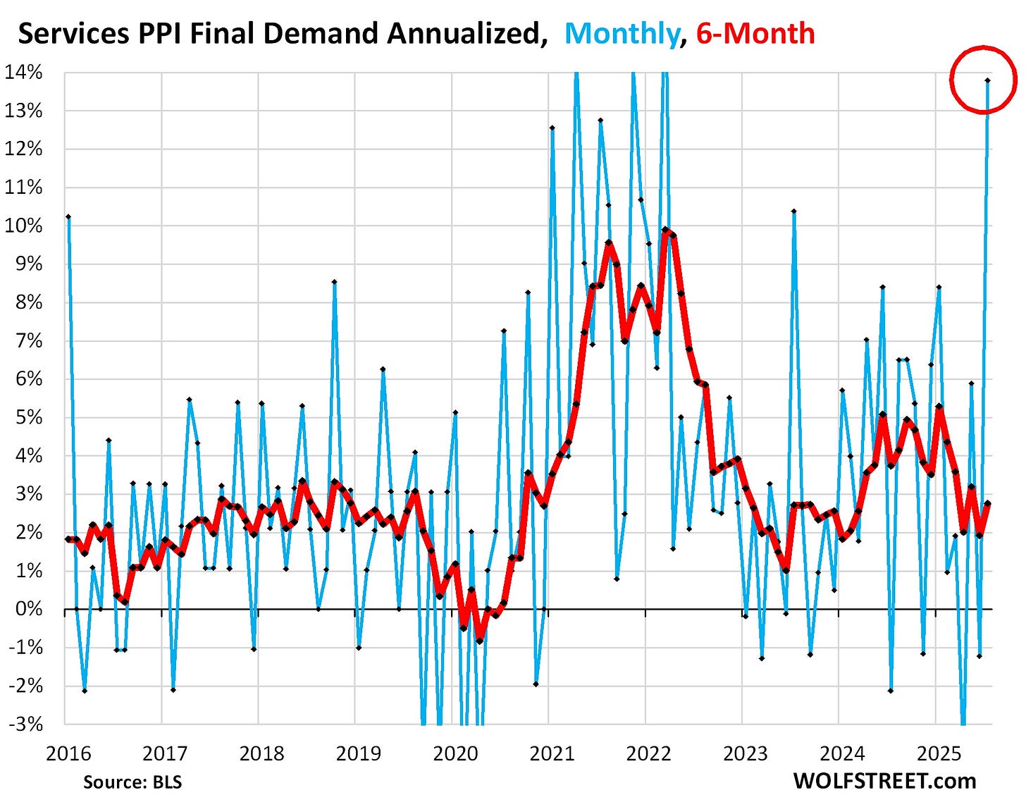 It’s worth noting that those Fed rate cuts will occur with inflation still above the Fed’s 2% target range. One important measure, the core services PPI, just spiked: