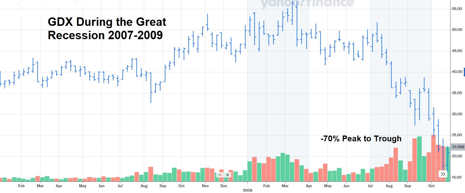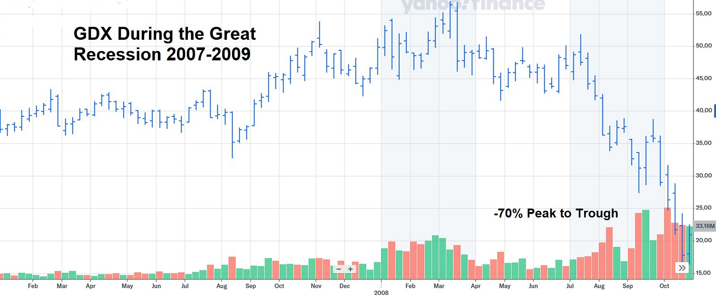 Pretty much every other equity valuation metric is also flashing red. So if past is still prologue, a stock market crash is a very real possibility in the year ahead. And that could hit the miners hard. In the last serious stock market crash, during the Great Recession of the 2000s, GDX fell by 70%: