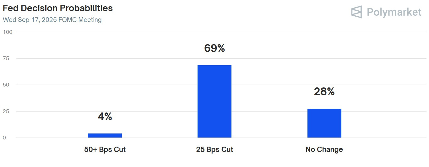 President Trump really, really wants lower interest rates, and he’s been publicly berating Fed governors over their failure to deliver. Now it looks like they’ll capitulate and start cutting in September, with Polymarket odds of a 25 bps cut at 69%: