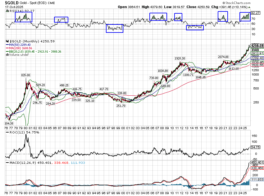 Is it possible that gold could rise from where it is today to $50,000 or $100,000? Bitcoin was less than the current price of gold in March of 2020 and stands today at over $108,000, so yes, I guess it is possible. Is it likely? I don’t think so which is why we sold some from our portfolios last week. I also sold some of our platinum and palladium holdings for similar reasons. But our portfolios still hold all three; the selling we did was to reduce our positions back to their original weighting. Gold is a strategic asset in our portfolios so we will always hold some. Platinum and palladium were tactical choices based on fundamental supply/demand factors that I believe still apply. But the opportunity to harvest a large gain made in a short period of time is not offered by the markets very often, so I take it when I get it.