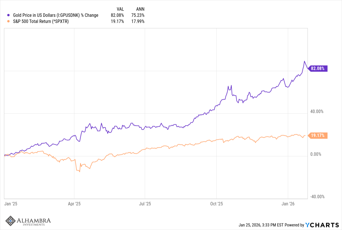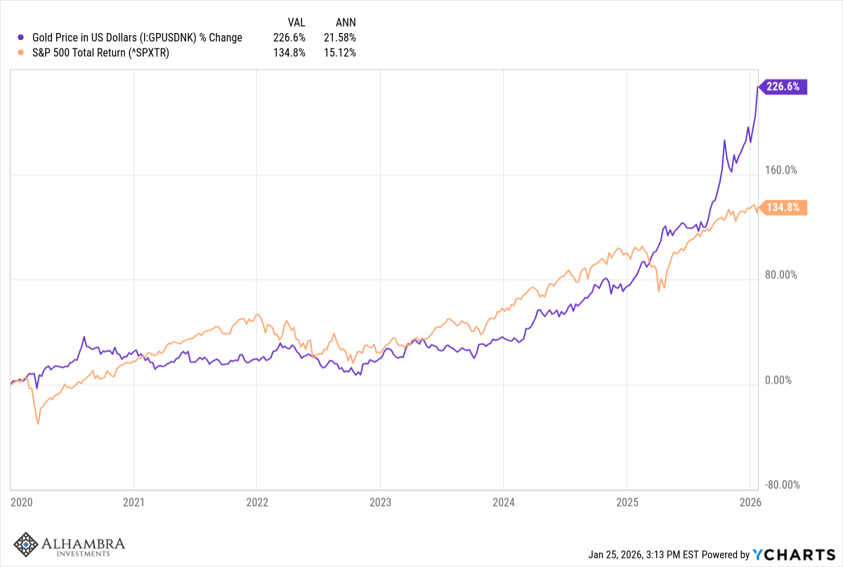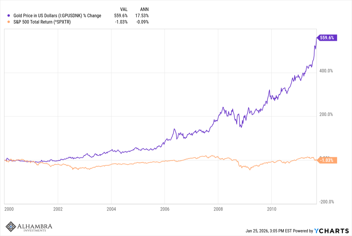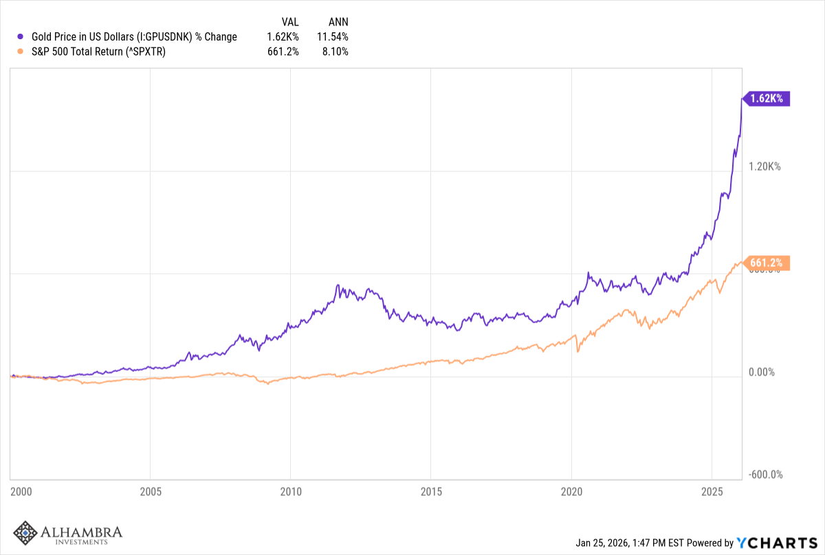 There has been a lot of debate about what the rise in the price of gold means but I don’t think there is really one explanation. It is certainly not coincidence that the periods of gold outperformance have come during periods of loose monetary policy, first in the post dot com boom period and today in the post-COVID period. Gold has acted as a check on monetary excess for thousands of years and it doesn’t appear that has changed, even though gold no longer plays a role in official monetary matters. It seems unlikely – in the extreme – that gold rising from $250 an ounce in late 1999 to $5000 today has nothing to do with monetary policy. The speculation and financial fraud associated with the 2000-2009 and the 2020 to present periods cannot be coincidence either; rampant speculation requires money and in both periods there was plenty of it. If you cheapen money people do foolish things with it.