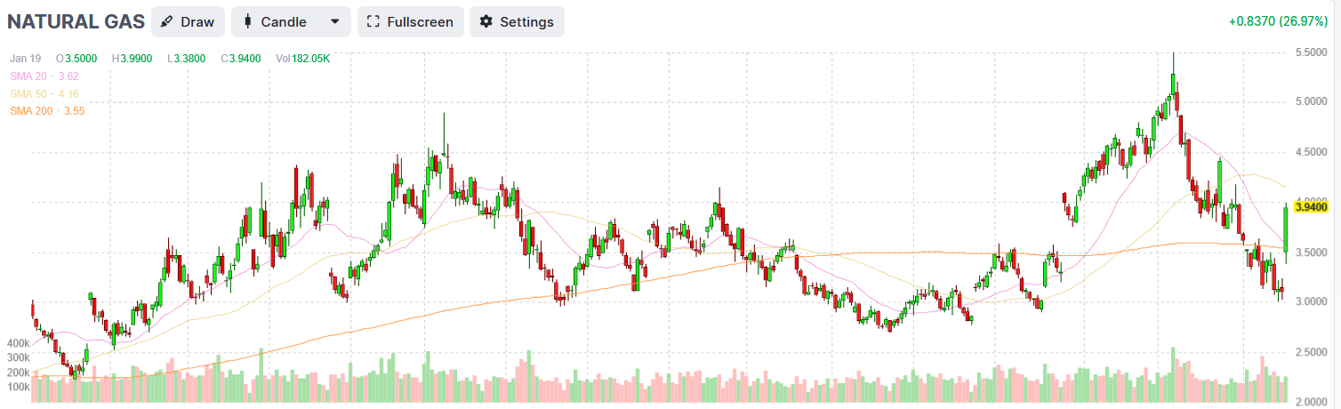 The latest weekly forecast calls for an Arctic airmass to cover the Midwest and the Northeast. As a result, natural gas prices jumped by over 25% on Tuesday’s open, making it the 3rd largest daily gain in history. Meteorologists estimate that temperatures will be up to 25 degrees below average across the Northeast and Midwest of the US over the coming ten days. As we share below, the price of natural gas is up sharply but well below the $5.50 peak set in early December. Natural gas prices tend to be heavily correlated with weather forecasts. Thus, given the severity of the cold, the surge is not surprising. The question will be what the longer-range forecasts for February look like and what impact they will have on prices.