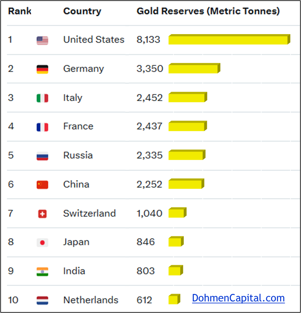 Below is a chart of the latest data showing the gold holdings of the biggest holders. As the chart below shows (data via World Gold Council), the gold holdings by the U.S. are more than twice the holdings of Germany, the 2nd biggest holder.