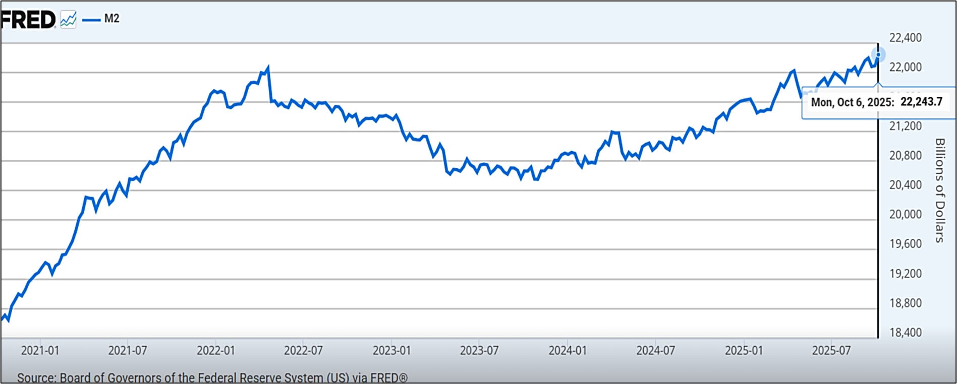 Take a look at this chart of U.S. M2 money supply. The latest data shows that it hit another record high in early October (chart below via the St. Louis Fed).