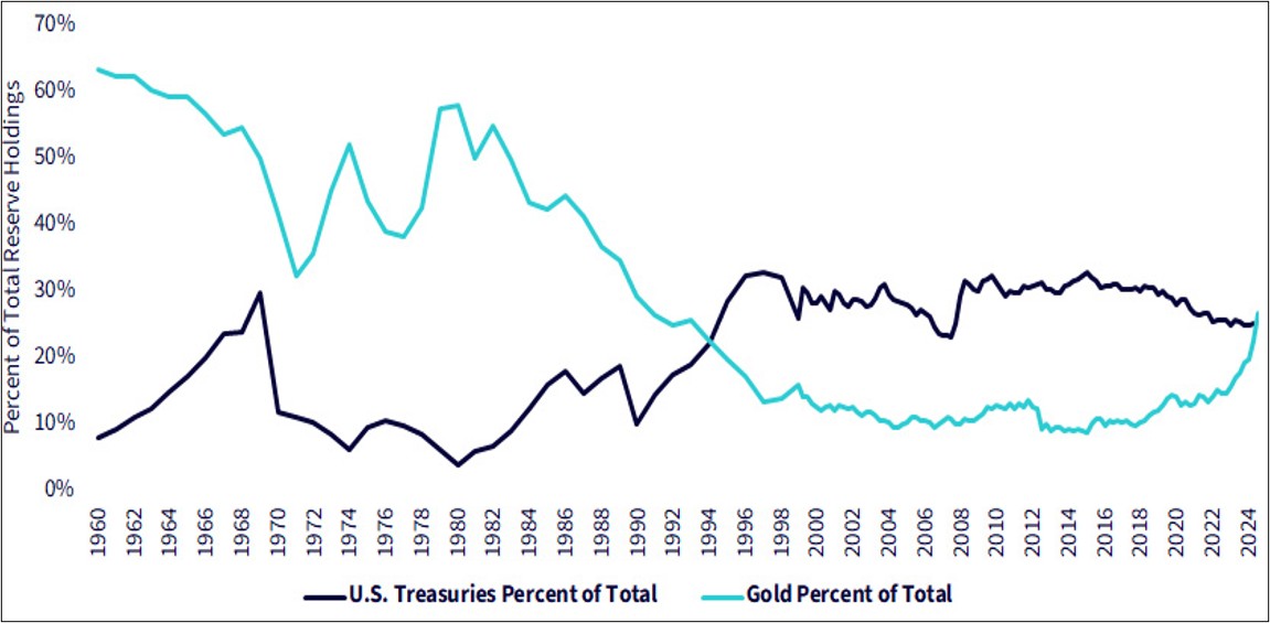 Below is the chart of central bank holdings of GOLD versus holdings of US Treasuries debt (chart from WisdomTree). Notice how just this past September, central banks are holding a higher share of Gold (teal line) than U.S. Treasuries (black line). That’s the first time this has happened in nearly 30 years.