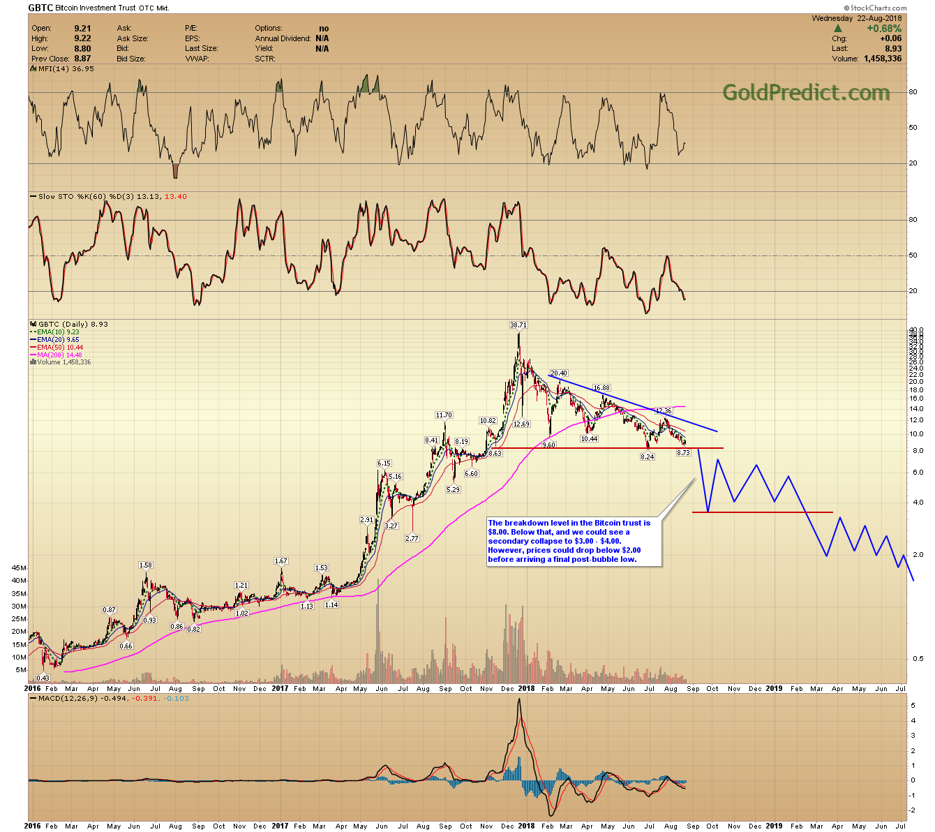 The recent rebound to $7.48 in GBTC is likely just a backtest of the prior breakdown described in the August update. Prices should rollover around here and continue to grind sideways/lower in a consolidation that eventually breaks to new lows. If correct, that implies bitcoin will break down below $3000, and I expect to see $1000 and $2000 before prices begin to base.
