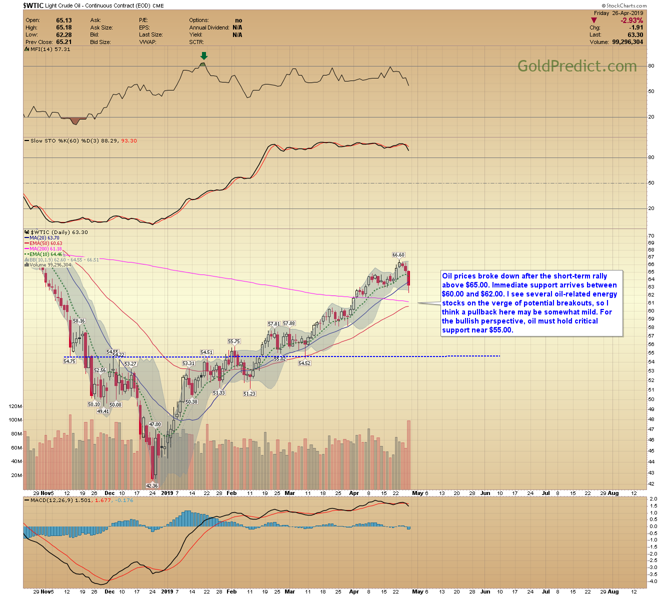 Oil prices broke down after the short-term rally above $65.00. Immediate support arrives between $60.00 and $62.00. I see several oil-related energy stocks on the verge of potential breakouts, so I think a pullback here may be somewhat mild. For the bullish perspective, oil must hold critical support near $55.00.