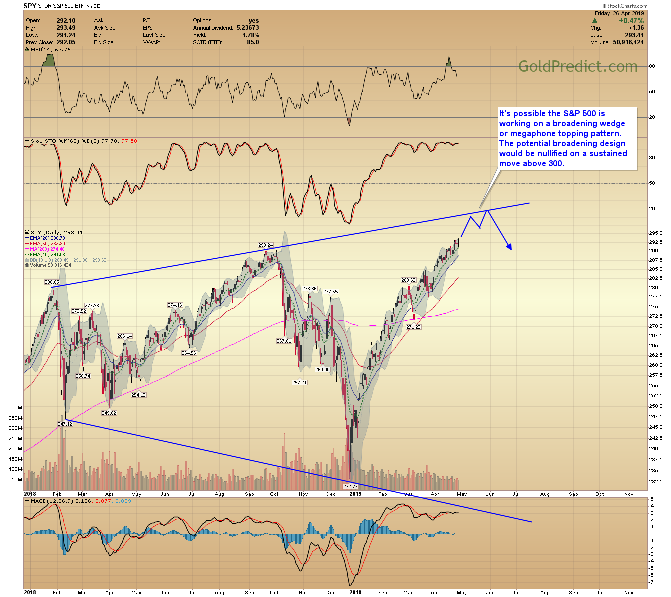 It’s possible the S&P 500 is working on a broadening wedge or megaphone topping pattern. The potential broadening design would be nullified on a sustained move above 300.