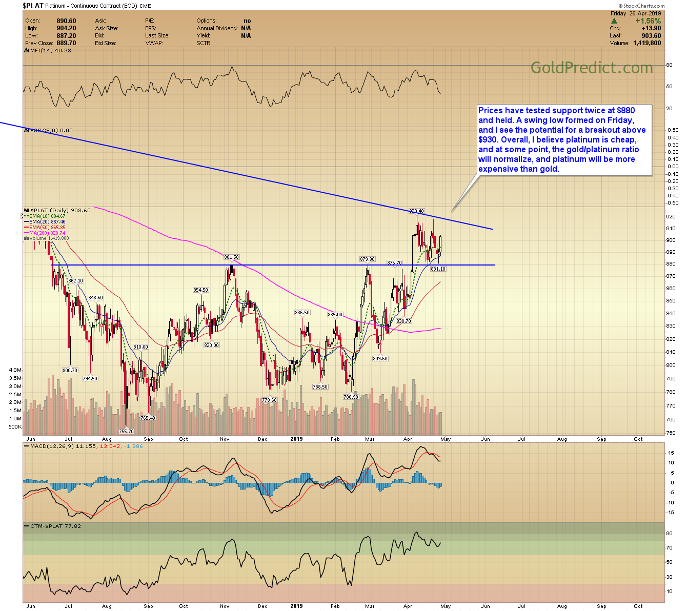 Prices have tested support twice at $880 and held. A swing low formed on Friday, and I see the potential for a breakout above $930. Overall, I believe platinum is cheap, and at some point, the gold/platinum ratio will normalize, and platinum will be more expensive than gold.