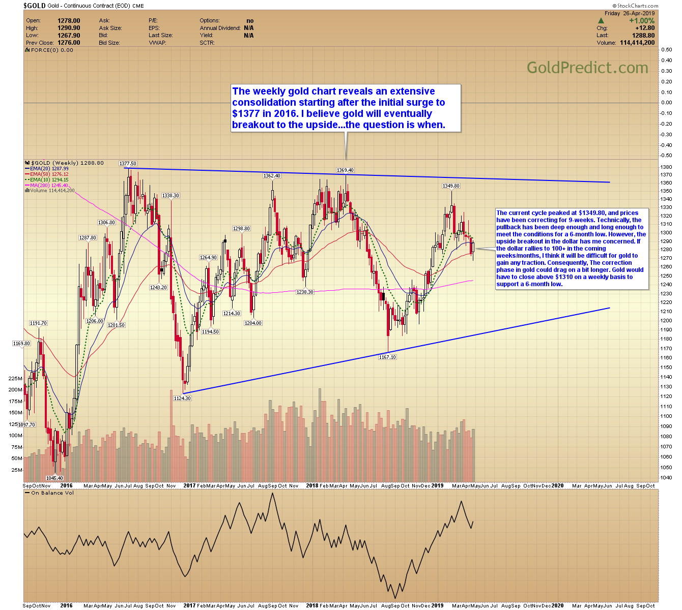 The weekly gold chart reveals an extensive consolidation starting after the initial surge to $1377 in 2016. I believe gold will eventually breakout to the upside…the question is when.