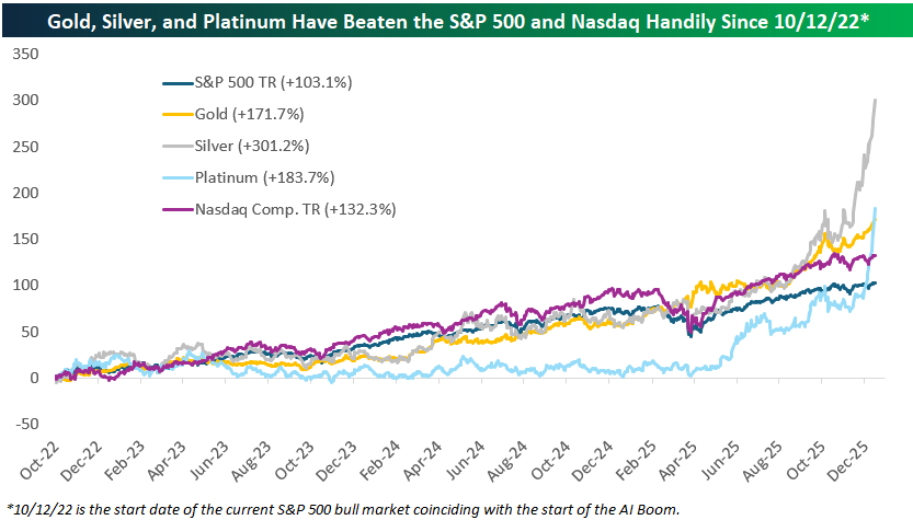 A doubling of the major indices over a 3+ year time frame certainly qualifies as a strong bull market, and it's hard to argue that valuations aren't a bit lofty. But if the current AI-driven bull market for stocks is a "bubble," then certainly what we've seen in precious metals lately qualifies as well.