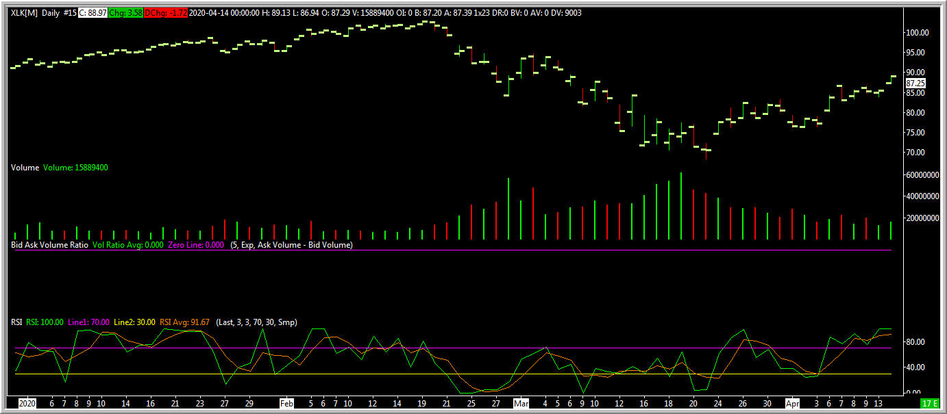 Technology stocks (XLK) have bounced quite nicely from the market lows, reflecting favorable outlooks for an online world during a period of social distancing. For example, we recently saw new 52-week highs for Amazon.