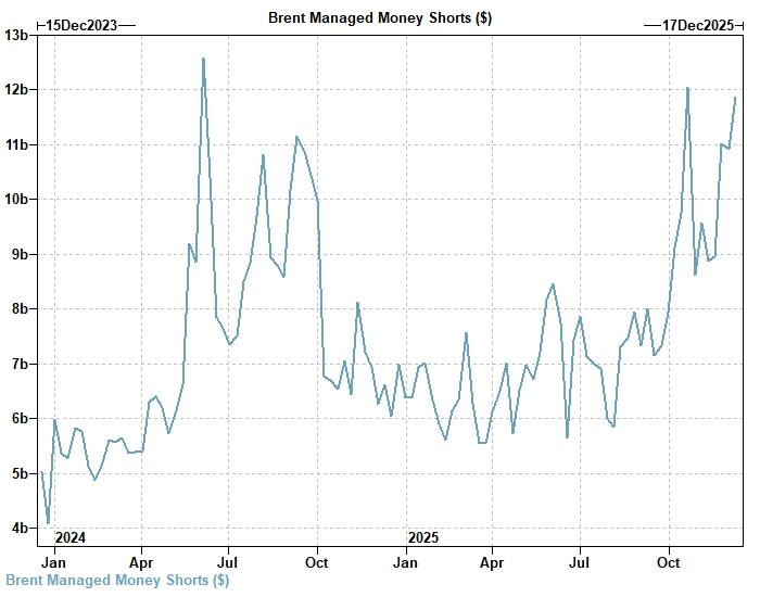 Over the past few weeks, Brent crude positioning grew increasingly short. The last Commitment of Traders report, covering through December 9th, exhibited Managed Money shorts at a 98% 2-year rank.