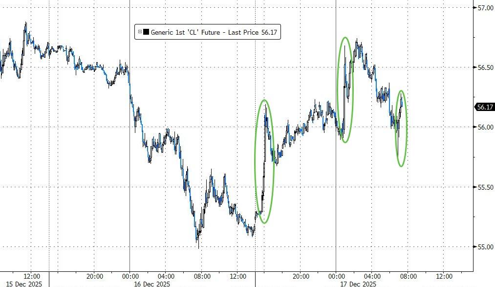 Oil prices surged overnight, jumping off multi-year lows after President Trump ordered a "total and complete blockade" of oil tankers into and out of Venezuela.