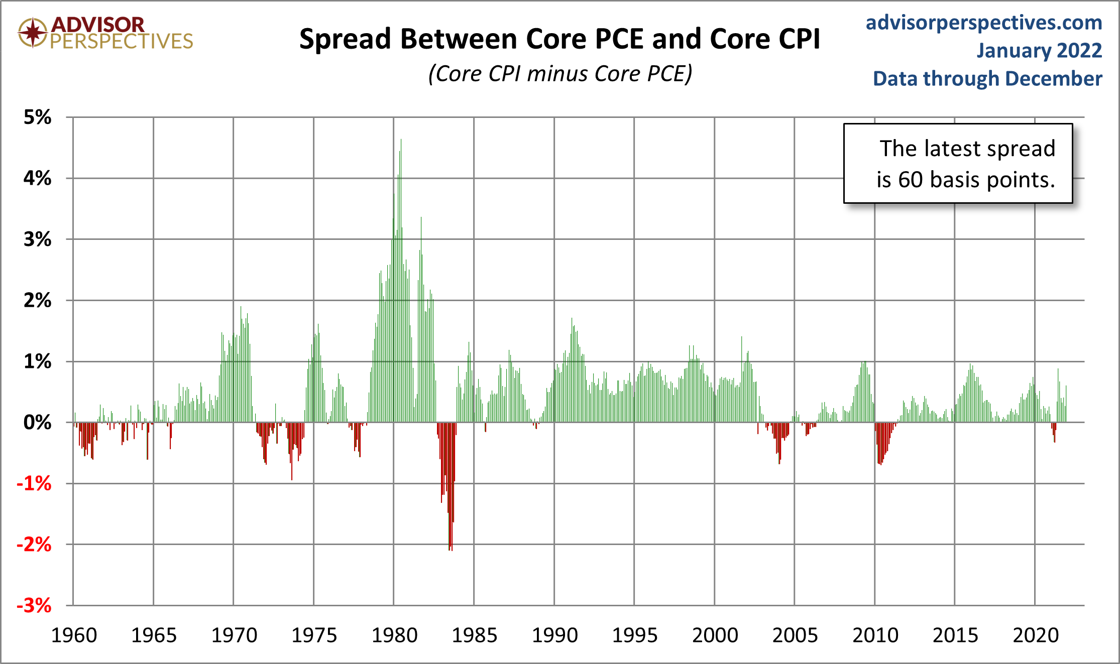 Here is an illustration of the spread between the two core metrics since 1960 through the latest month when both indicators have been published.