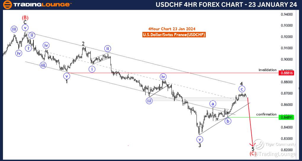 The "USDCHF Elliott Wave Analysis Trading Lounge 4 Hour Chart" dated 23 January 24, provides a detailed analysis of the U.S. Dollar/Swiss Franc (USDCHF) currency pair using Elliott Wave theory, a technical approach that aims to identify recurring wave patterns in financial markets for predictive purposes.