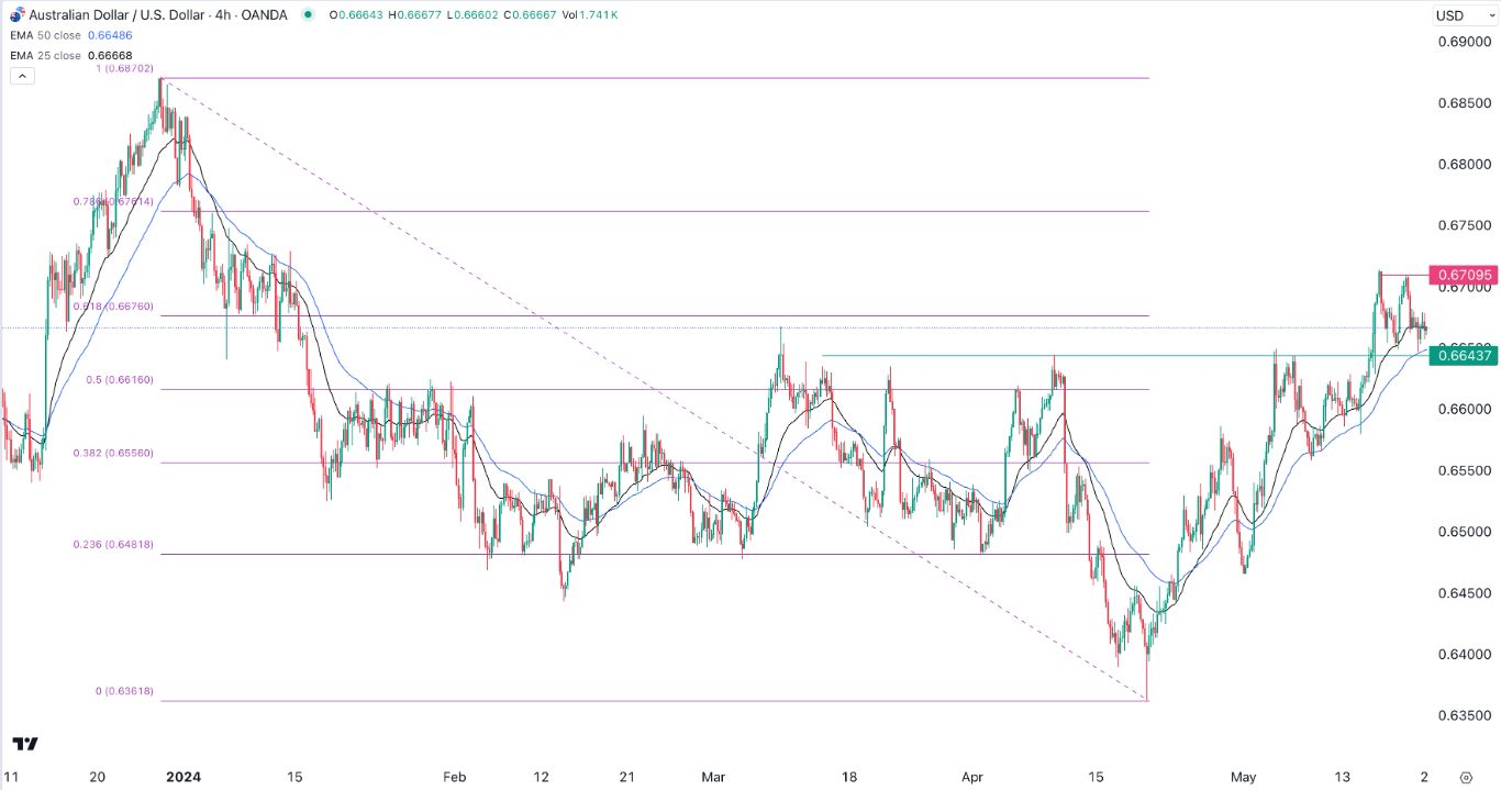 The pair is hovering at the 61.8% Fibonacci Retracement point. It is also slightly above the key support at 0.6643, its highest swing on April 9th of this year. This performance is a sign that it has formed a break and retest pattern, a popular continuation sign.