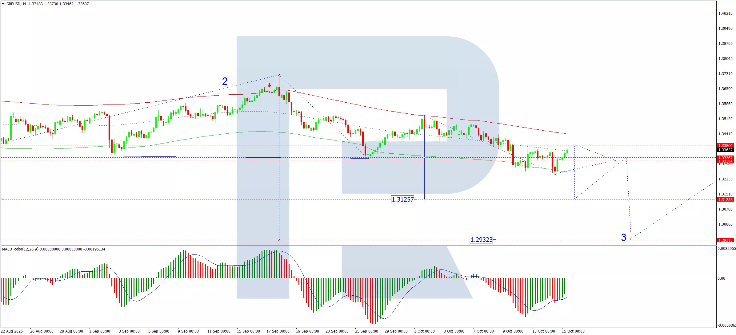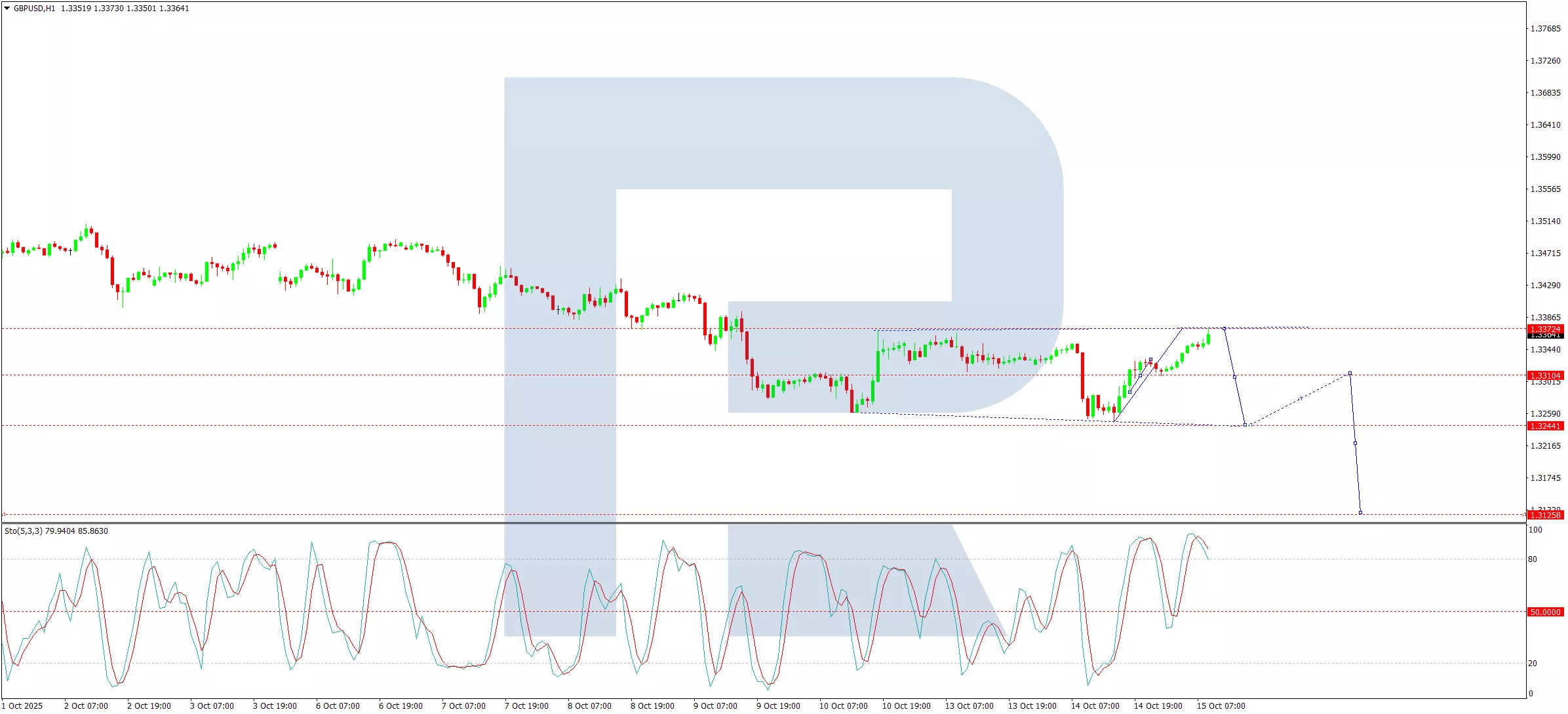 The pair has also formed a consolidation range around 1.3310, with the third wave of the broader downtrend now largely confirmed. The first leg of this wave reached 1.3252, followed by a correction to 1.3372. A further decline toward at least 1.3244 is anticipated, with an extension of the downward structure to 1.3125 also possible. The Stochastic oscillator confirms this scenario, with its signal line below 80 and trending downward towards 20.