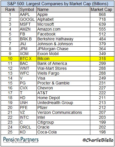 - And the total market cap of the 10 largest crypto-currencies has now reached $500bn, equal to Facebook