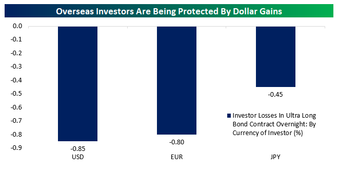 As we’ve discussed a number of times over the past several months, the flow and market price data does not support the idea that non-US investors are fleeing en masse as was feared in the wake of the Liberation Day tariff announcement. We continue to watch price action and the relationship between movements in stocks, rates, and the dollar for signs of that dynamic, and they were again lacking overnight. While UST yields have moved higher as stocks have sold off, the bear-steepening has been relatively modest with 30y yields up less than 5 bps this morning. The dollar has actually rallied today. As shown below, unhedged investors denominated in EUR or JPY are actually seeing smaller losses on US duration overnight than USD-based investors, the opposite of what we would expect if new tariffs were generating a capital flight scenario.