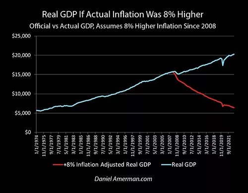 However, if inflation had actually been 8% higher each year, then economic growth would have been much lower. Indeed, in very much simplified terms, if an economy is said to be growing 2% per year in inflation-adjusted terms, but the actual rate of inflation is 8% higher than the official rate, then that means the economy must be shrinking 6% per year, which would be associated with a severe recession.