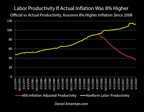 If we accept an 8% higher rate of inflation, something a little over 10%, and we let it compound over 15 years, then we will necessarily get an entirely different picture of labor productivity, as can be seen with the red line. Labor productivity must now be plunging with each year that goes by. Instead of increasing by about 2.35 times, labor productivity must have fallen down to a level that is only 32% of the current official productivity. Labor productivity would not only be lower than in 1974, but it would be down to only about 75% of what it was that year.