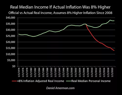 Now, if the real inflation rate has been 8% higher than what the government says, that necessarily means that the growth in real income has been 8% lower each year, and since the annual growth rates were never above 8%, that then means that real incomes have been dropping every year. And if we take into account inflation on inflation, when a 10%+ rate of inflation is compounding - that must mean that real incomes have been plunging every year.