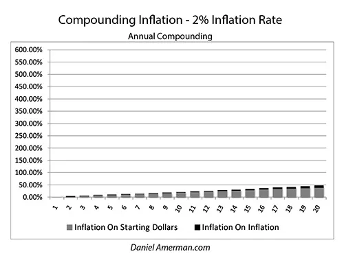 Low-interest rates - and low inflation rates - compound very slowly. A 2% rate of inflation will steadily destroy the value of money, but it will lack the basic fuel for rapid compounding. The graph above shows inflation only, not including the starting prices, and the dark bar of compound inflation on inflation is quite small over the entire twenty years.