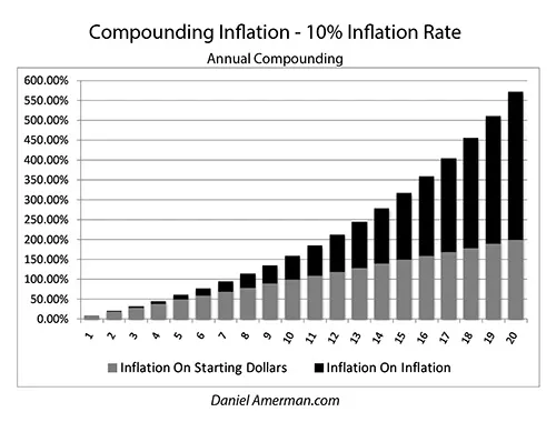 Now, if we had a ten percent rate of inflation for the same twenty years, we get very different results. Yes, the lighter bars of inflation on starting dollars are quite a bit higher each year. However - as is always the case with exponential mathematics - when we drastically increase the compounding rate, we drastically increase the inflation on the inflation component. The dark bars now leap upwards, and over time, it is this inflation on inflation that comes to completely dominate future price levels. There is an extraordinary difference in the dark bars of inflation on inflation when comparing 2% and 10% rates of inflation.