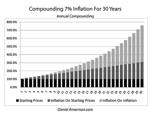 When we look at a graph of compound 7% inflation it is therefore mathematically identical to the graph for compound 7% interest, we're just changing the labels. "Original Principal" becomes "Starting Prices", and "Interest" is replaced with "Inflation". It now takes almost twice as many dollars to support a given standard of living in 10 years, three times as many dollars in 17 years, and four times as many dollars in 21 years. Critically, at high rates of inflation over time, the compound inflation on inflation becomes more important than the simple inflation.