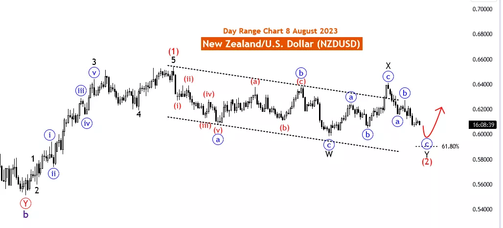 On 8th August 23, the day chart of the New Zealand Dollar/U.S. Dollar (NZDUSD) pair is subjected to Elliott Wave analysis, indicating a counter-trend movement with a corrective mode. The function of the price movement is identified as counter-trend, while the mode is characterized as corrective.
