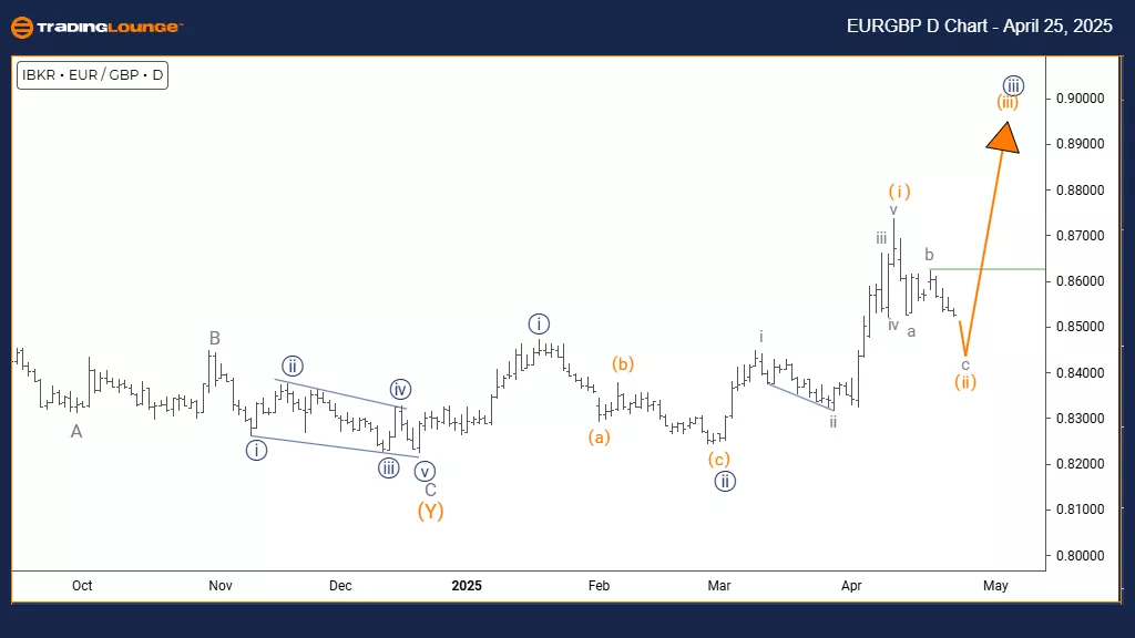 The EURGBP daily chart currently shows a corrective movement against the dominant bearish trend. After the completion of the orange wave 1 decline, the pair has entered orange wave 2—a corrective phase within the broader navy blue wave 3 downtrend. This setup signals a temporary upward retracement before the likely continuation of the main bearish movement.