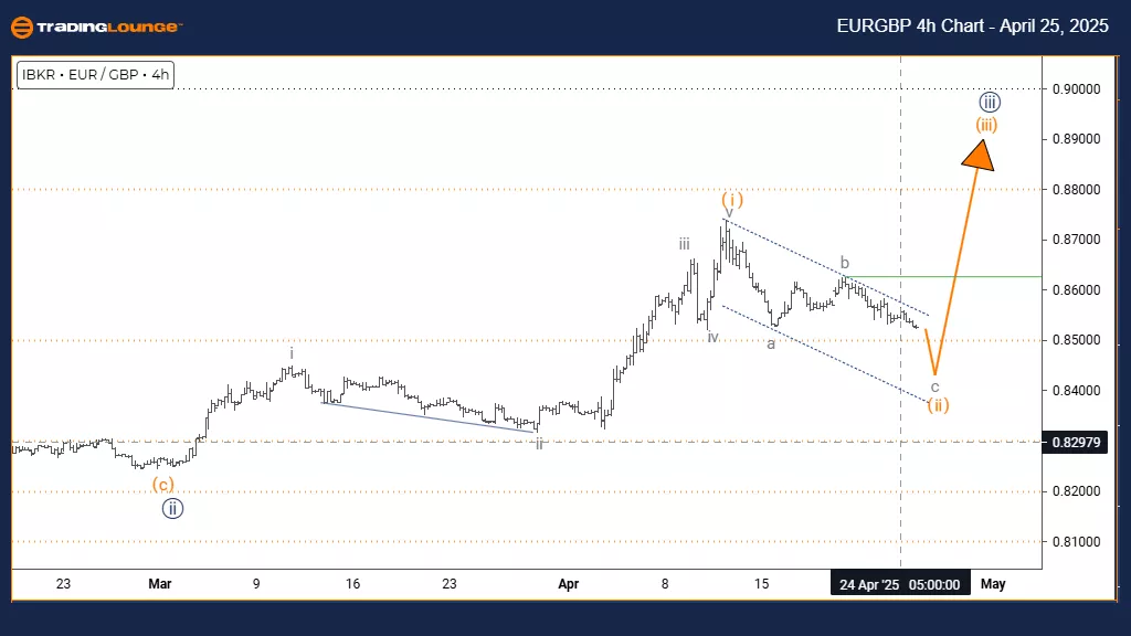 The EURGBP 4-hour chart shows a counter-trend pattern developing through an impulsive wave sequence. Following the completion of gray wave B, the pair has moved into gray wave C within the larger corrective structure of orange wave 2. This phase suggests a temporary upward price movement within a broader retracement setup.