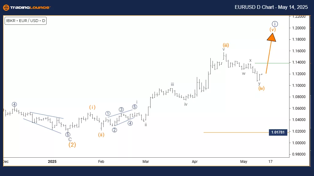 The daily chart reflects a bullish outlook for the EURUSD pair, with notable upward movement within an impulsive wave framework. Present analysis identifies that orange wave 5 is forming within the broader structure of navy blue wave 1. This indicates the currency pair has finalized the correction seen in orange wave 4 and has entered the final phase of upward movement within this impulse wave. This development often marks the last segment of upward momentum before a likely trend reversal or deeper correction begins.