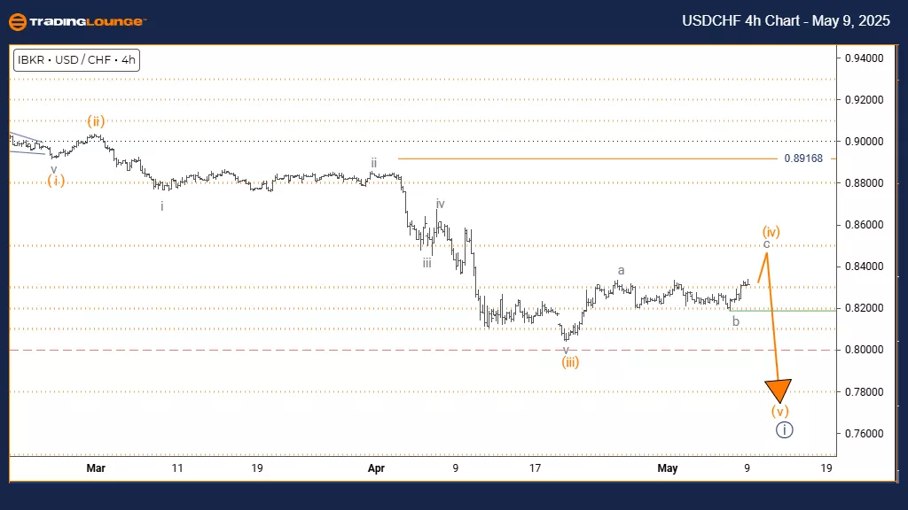 On the USDCHF daily chart, current market behavior shows a counter-trend phase with a corrective price pattern. This situation is identified as the development of orange wave 4, embedded within the broader structure of a downward impulse wave – navy blue wave 1. This configuration implies a temporary pause in the prevailing bearish trend, signaling potential for near-term consolidation or mild recovery.
