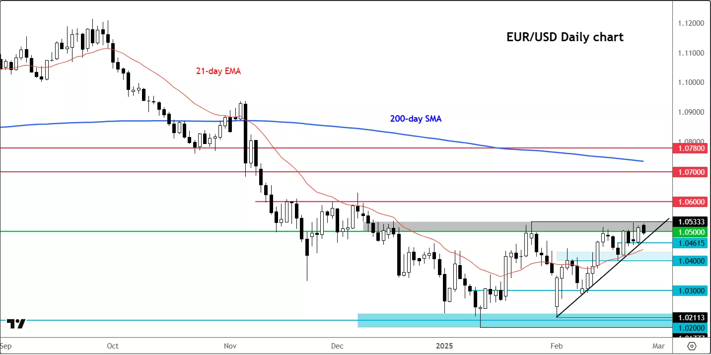 Holding the EUR/USD exchange rate back is lingering tensions between the US and Europe amid concerns over Trump’s stance on tariffs, coupled with uncertainty over the Ukraine peace process talks. Not that data has been any great, as we saw in last week’s Eurozone PMIs and this week’s German ifo Business Climate and GfK Consumer Climate. But with the German election uncertainty out of the way, and the peace talks over Ukraine continuing, this should keep the euro’s weakness limited, even if incoming data continues to point to a struggling Eurozone economy that requires looser monetary policy from the European Central Bank.