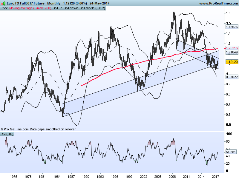 After years of decline, the euro has bounced off a key support line at 1.04. Considering the divergence between price and the Relative Strength Index (RSI) indicator on the weekly chart, the next target is 1.15. A move above that level could support prices to 1.18/1.28. Since 1974, the EUR/USD (DMUSD) has tended to bottom every 15 years: 1995, 2000, and 2016 (?). Declines have lasted for 5–6 years (1980–1985, 1995–2000 and 2011–2016) before reversing. Downtrends have extended for about 40%–50% top to bottom (1.17–0.58, 1.47–0.84 and 1.52–1.04).
