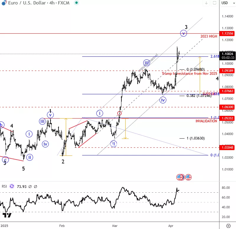 As expected, EURUSD is coming higher now, trading in wave five of an impulse, extended black wave 3 that that touched the Fib resistance zone as expected here around 1.11 area. So with this new leg up it really seems that big and important low for the EURUSD is in place at 1.02 and that market can stay bullish for some time as big corrective drop appears completed on daily and weekly charts. However, be aware of some set-back in the meantime,and possibly new retracement may not be far away.