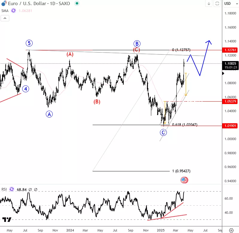 We talked a lot about the bearish U.S. dollar in the past weeks. We also shared EURUSD already back on March 05, where we mentioned and highlighted a bullish reversal after we spotted strong support within a larger ABC corrective decline. Link here.
