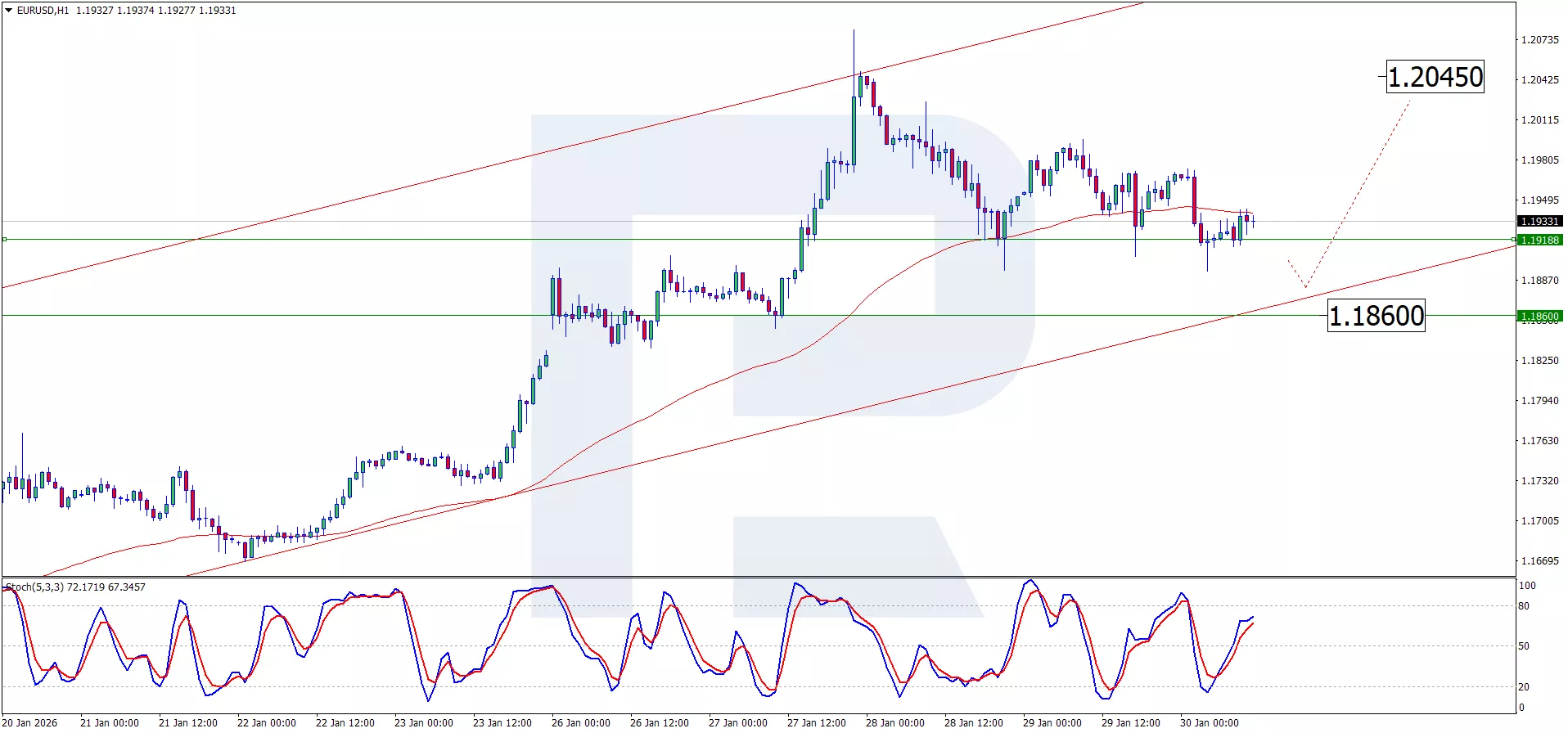 On the H1 chart, the pair is forming a correction after testing the resistance level. A rebound from the support level of 1.1860 would signal the formation of a new growth wave. The Stochastic oscillator's signal lines are pointing towards level 80, suggesting the uptrend may continue. Subsequently, the target for growth may be 1.2045.