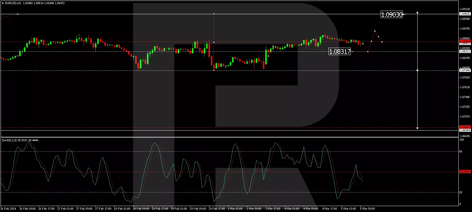 The H1 chart reveals a consolidation phase around the 1.0831 level, with a growth structure targeting 1.0870 currently unfolding. The local target of 1.0866 for this wave has been achieved, with a correction back to 1.0831 anticipated. Following this correction, the focus will shift towards the structure's growth potential to 1.0870. The Stochastic oscillator, currently below the 50 mark and expected to drop to 20, validates this scenario, suggesting a potential for further fluctuations within this bullish trend.