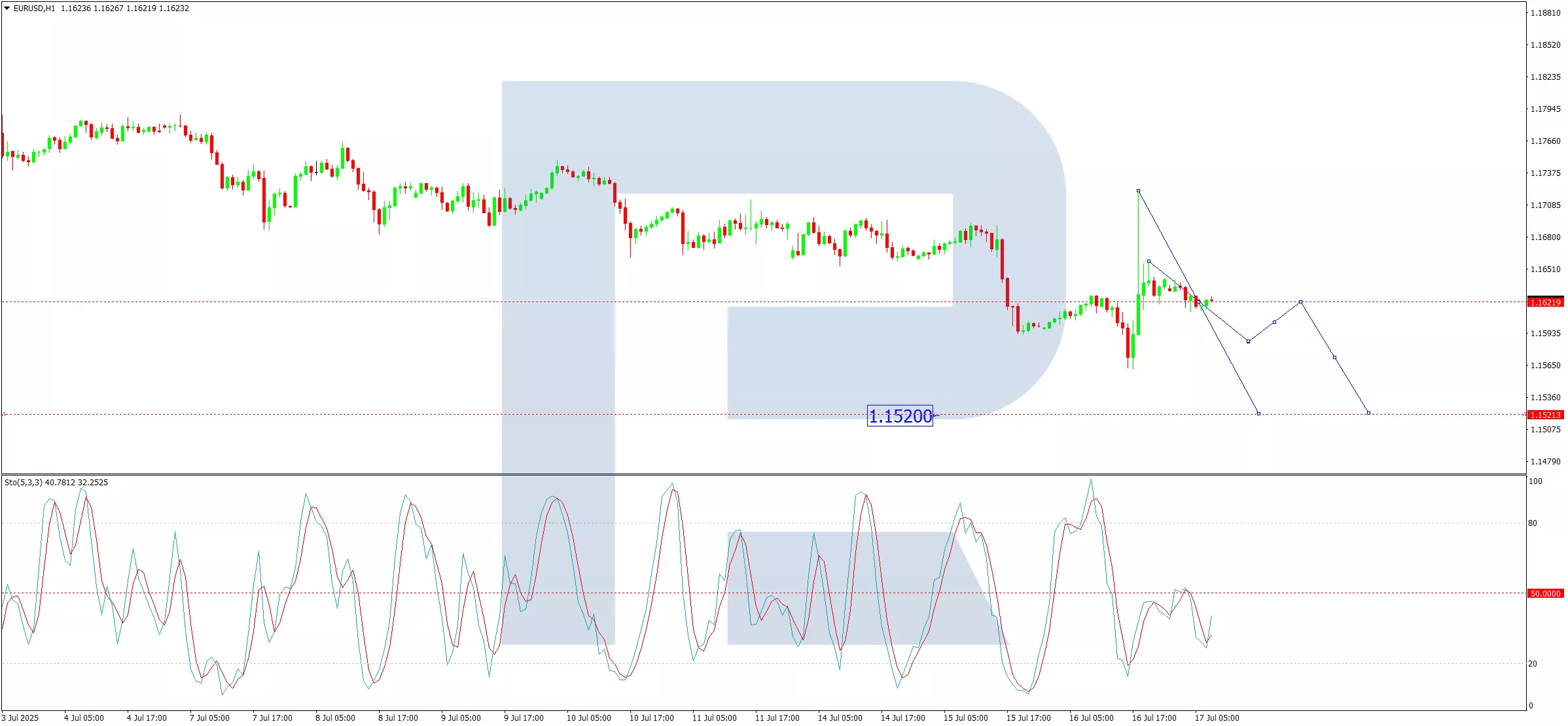 On the H1 chart, the EUR/USD pair has executed a downward impulse to 1.1610, followed by a correction to 1.1658. Today, a tight consolidation range is expected to form around 1.1620. If the pair breaks lower from this range, a move towards 1.1585 becomes likely, with the potential for further downside continuation to 1.1520. Technically, this scenario is confirmed by the Stochastic oscillator: its signal line lies below 50 and is heading sharply lower towards 20.