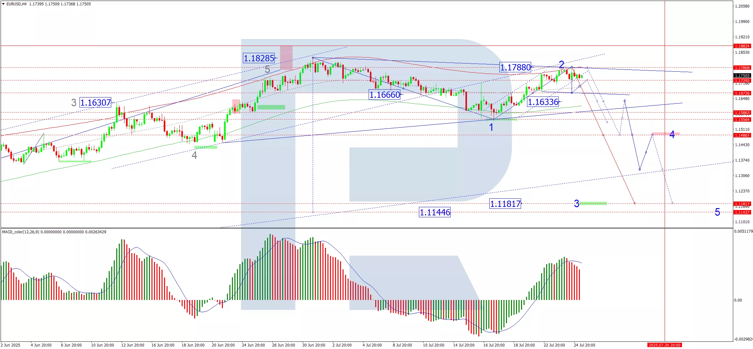 The EUR/USD has completed an upward wave towards 1.1788 on the H4 chart. Today, we expect a downward impulse to 1.1723, followed by a potential rebound to 1.1755. The pair is likely to enter a consolidation range near the peak of this upward wave, with a possible breakout to the downside towards 1.1670 as the primary target. This scenario is supported by the MACD indicator, where the signal line remains above zero but is trending sharply downward.