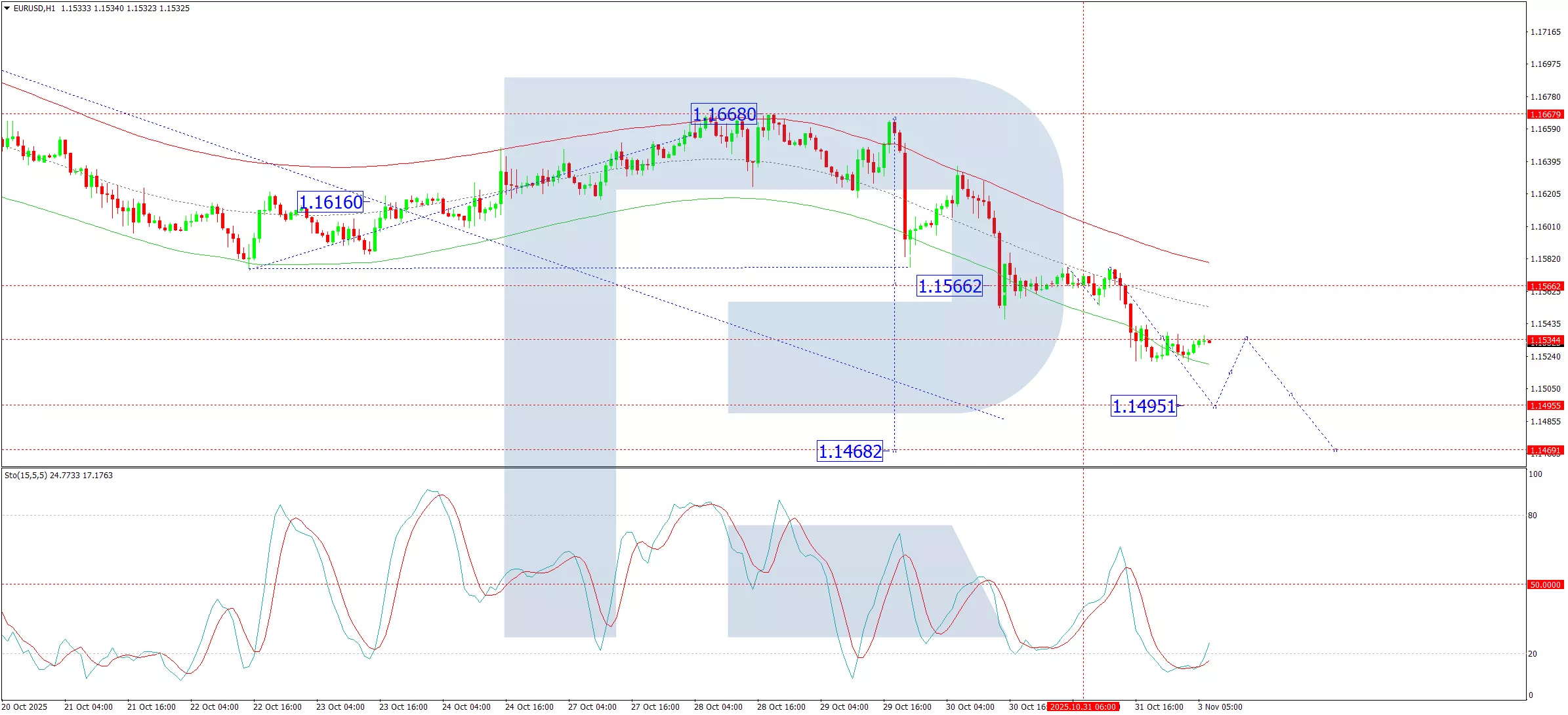 On the H4 chart, EUR/USD formed a tight consolidation range around 1.1569. A subsequent downward breakout completed a bearish wave to 1.1521, and the pair is now consolidating above this local low.